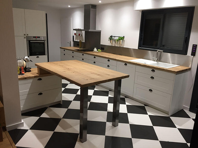 AIE Menuiserie réalise des cuisines sur mesure adaptées à votre espace et à vos habitudes. L’agencement est étudié pour optimiser les rangements, faciliter la circulation et créer un espace convivial.